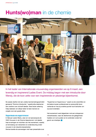 SPREEKBUIS april 2025 10 De sessie startte met een unieke kennismakingsactiviteit genaamd %u201cDomino Introductie,%u201d waarbij elke deelnemer een oneliner over zichzelf deelde. Deze leuke oefening hielp iedereen om elkaar beter te leren kennen en zorgde voor een goede sfeer.Superman en supervrouwIn februari waren Maria, Joan en Lisl aanwezig bij de VNCI Vrouwen in de Chemie bijeenkomst. Lisl deelde haar ervaringen en inzichten van het evenement, waarbij ze het belang van netwerken en ondersteuning onder vrouwen in de industrie benadrukten.Denise boeide de aanwezigen met haar presentatie over %u201cSuperman en Supervrouw,%u201d waarin ze de verschillen en de balans tussen professioneel en persoonlijk leven verkende en hoe je je sterke punten kunt benutten om succes te behalen.Het evenement werd afgesloten met een ontspannen netwerksessie, waar de deelnemers de gelegenheid hadden om na te praten en te verbinden onder het genot van drankjes. Hunts(wo)man in de chemieIn het kader van Internationale vrouwendag organiseerden we op 6 maart, een levendig en inspirerend Ladies Event. De middag begon met een introductie door Wendy, die de toon zette voor een inspirerende en plezierige bijeenkomst.