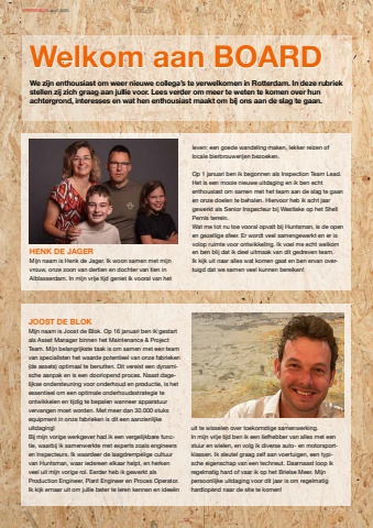 SPREEKBUIS april 2025 12 HENK DE JAGERMijn naam is Henk de Jager. Ik woon samen met mijn vrouw, onze zoon van dertien en dochter van tien in Alblasserdam. In mijn vrije tijd geniet ik vooral van het leven: een goede wandeling maken, lekker reizen of locale bierbrouwerijen bezoeken.Op 1 januari ben ik begonnen als Inspection Team Lead. Het is een mooie nieuwe uitdaging en ik ben echt enthousiast om samen met het team aan de slag te gaan en onze doelen te behalen. Hiervoor heb ik acht jaar gewerkt als Senior Inspecteur bij Westlake op het Shell Pernis terrein.Wat me tot nu toe vooral opvalt bij Huntsman, is de open en gezellige sfeer. Er wordt veel samengewerkt en er is volop ruimte voor ontwikkeling. Ik voel me echt welkom en ben blij dat ik deel uitmaak van dit gedreven team. Ik kijk uit naar alles wat komen gaat en ben ervan overtuigd dat we samen veel kunnen bereiken!JOOST DE BLOK Mijn naam is Joost de Blok. Op 16 januari ben ik gestart als Asset Manager binnen het Maintenance & Project Team. Mijn belangrijkste taak is om samen met een team van specialisten het waarde potentieel van onze fabrieken (de assets) optimaal te benutten. Dit vereist een dynamische aanpak en is een doorlopend proces. Naast dagelijkse ondersteuning voor onderhoud en productie, is het essentieel om een optimale onderhoudsstrategie te ontwikkelen en tijdig te bepalen wanneer apparatuur vervangen moet worden. Met meer dan 30.000 stuks equipment in onze fabrieken is dit een aanzienlijke uitdaging!Bij mijn vorige werkgever had ik een vergelijkbare functie, waarbij ik samenwerkte met experts zoals engineers en inspecteurs. Ik waardeer de laagdrempelige cultuur van Huntsman, waar iedereen elkaar helpt, en herken veel uit mijn vorige rol. Eerder heb ik gewerkt als Production Engineer, Plant Engineer en Proces Operator. Ik kijk ernaar uit om jullie beter te leren kennen en idee%u00ebn uit te wisselen over toekomstige samenwerking.In mijn vrije tijd ben ik een liefhebber van alles met een stuur en wielen, en volg ik diverse auto- en motorsportklassen. Ik sleutel graag zelf aan voertuigen, een typische eigenschap van een techneut. Daarnaast loop ik regelmatig hard of vaar ik op het Brielse Meer. Mijn persoonlijke uitdaging voor dit jaar is om regelmatig hardlopend naar de site te komen!Welkom aan BOARDWe zijn enthousiast om weer nieuwe collega%u2019s te verwelkomen in Rotterdam. In deze rubriek stellen zij zich graag aan jullie voor. Lees verder om meer te weten te komen over hun achtergrond, interesses en wat hen enthousiast maakt om bij ons aan de slag te gaan.