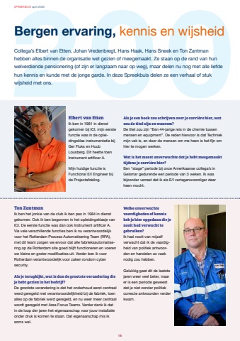 SPREEKBUIS april 20253Vanuit de hoogte een ander perspectiefOnder begeleiding van Kal Khogali en Ron Groenland werd Crystallizer 5 beklommen. Vanaf de 52 meter hoge Crystallizer 5 werd nog duidelijker hoe groot en dynamisch ons werkgebied is. Hier kregen onze bezoekers inzicht in de intensieve samenwerking binnen het cluster en werd duidelijk hoe bedrijven in het cluster grondstoffen uitwisselen, hoogwaardige werkgelegenheid bieden aan duizenden mensen en essenti%u00eble chemische producten produceren. Het chloorcluster.Naast Huntsman waren andere leden van het chloorcluster aanwezig, waaronder LyondellBasell, Nobian, Shin-Etsu en Air Liquide. Samen vormen we een netwerk van bedrijven die elkaar versterken, producten aan elkaar leveren en gezamenlijk werken aan een effici%u00ebnte en duurzame chemische industrie. Innovatie versus uitdagingenTijdens het bezoek werd uitgebreid gesproken over de voortdurende innovatie binnen de chemische sector. Bedrijven maakten duidelijk hoe zij dagelijks werken aan verduurzaming en de ontwikkeling van nieuwe, schonere producten. Tegelijkertijd werd benadrukt dat de hoge netkosten voor elektriciteit en nationale extra belastingen zoals de CO2-heffing en de plasticheffing het speelveld in Nederland minder gunstig maken ten opzichte van onze buurlanden. En dat terwijl wij het schoonste en meest effici%u00ebnte chloorcluster ter wereld zijn!Een geslaagde ochtendHet bezoek bood een waardevolle kans om te laten zien wat we bij Huntsman, samen met onze partners in het chloorcluster, realiseren en met welke uitdagingen we te maken hebben. We danken gedeputeerde Weverling en zijn team voor hun interesse en betrokkenheid. Samen blijven we werken aan een sterke en duurzame chemische industrie in Nederland! Op vrijdag 14 maart hadden we bij Huntsman de eer om gedeputeerde Arne Weverling, zijn ambtenaren en Femke Brenninkmeijer van de Economic Board Zuid-Holland te ontvangen voor een uniek bezoek aan Crystallizer 5. Namens het chloorcluster gaven wij hen een kijkje achter de schermen van onze sector en de chemische industrie in de Botlek. Met een stralende lucht en perfecte weersomstandigheden, technisch weer, zoals we dat graag noemen, was het een ideale dag om de bedrijvigheid in ons cluster van dichtbij te ervaren.