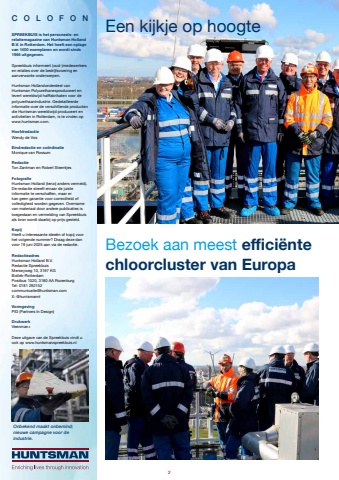 SPREEKBUIS april 2025 2 COLOFONSPREEKBUIS is het personeels- en relatiemagazine van Huntsman Holland B.V. in Rotterdam. Het heeft een oplage van 1400 exemplaren en wordt sinds 1964 uitgegeven.Spreekbuis informeert (oud-)medewerkers en relaties over de bedrijfsvoering en aanverwante onderwerpen.Huntsman Hollandonderdeel van Huntsman Polyurethanesproduceert en levert wereldwijd halffabrikaten voor de polyurethaanindustrie. Gedetailleerde informatie over de verschillende producten die Huntsman wereldwijd produceert en activiteiten in Rotterdam, is te vinden op www.huntsman.com.HoofdredactieWendy de VosEindredactie en co%u00f6rdinatieMonique van Rossum RedactieTon Zantman en Robert SteentjesFotografieHuntsman Holland (tenzij anders vermeld). De redactie streeft ernaar de juiste informatie te verschaffen, maar er kan geen garantie voor correctheid of volledigheid worden gegeven. Overname van materiaal door andere publicaties is toegestaan en vermelding van Spreekbuis als bron wordt daarbij op prijs gesteld.KopijHeeft u interessante idee%u00ebn of kopij voor het volgende nummer? Draag deze dan v%u00f3%u00f3r 19 juni 2025 aan via de redactie.RedactieadresHuntsman Holland B.V.Redactie SpreekbuisMerseyweg 10, 3197 KG Botlek-RotterdamPostbus 1020, 3180 AA RozenburgTel: 0181 292152communicatie@huntsman.comX: @huntsmannlVormgeving PID (Partners In Design)DrukwerkVeenman+Deze uitgave van de Spreekbuis vindt u ook op www.huntsmanspreekbuis.nlOnbekend maakt onbemind; nieuwe campagne voor de industrie.Bezoek aan meest effici%u00ebnte chloorcluster van EuropaEen kijkje op hoogte