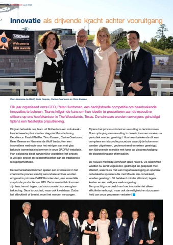 SPREEKBUIS april 2025 4 Dit jaar behaalde ons team uit Rotterdam een indrukwekkende tweede plaats in de categorie Manufacturing Excellence. Ewald Pfeiffer, Timo Eussen, Carine Overtoom, Kees Geerse en Nanneke de Wolff bedachten een innovatieve methode voor het reinigen van met glas beklede isomerisatiekolommen in onze DADPM-installatie. Hun oplossing biedt aanzienlijke voordelen: het proces is veiliger, sneller en kosteneffici%u00ebnter dan de traditionele reinigingsmethode.De isomerisatiekolommen spelen een cruciale rol in het chemische proces waarbij secundaire amines worden omgezet in primaire DADPM-moleculen, een essenti%u00eble stap in de productie van MDI. De isomerisatiekolommen zijn beschermd tegen zoutzuurcorrosie door een glasbekleding. Deze is cruciaal, maar ook kwetsbaar. Zodra het afbrokkelt of breekt, moet het worden vervangen. Tijdens het proces ontstaat er vervuiling in de kolommen. Door ophoping van vervuiling in deze kolommen moeten ze periodiek worden gereinigd. Voorheen betekende dit een complexe en risicovolle procedure waarbij de kolommen werden uitgehesen, gedemonteerd en extern gereinigd; een tijdrovende exercitie met kans op glasbeschadiging en blootstelling aan chemicali%u00ebn.De nieuwe methode elimineert deze risico%u2019s. De kolommen worden nu eerst uitgekookt, gedroogd en gespoeld met stikstof, waarna ze met een hogedrukreiniging en speciaal ontwikkelde sproeiers die met Mourik zijn ontwikkeld, worden gereinigd. Dit betekent minder stilstand, lagere kosten en een veiligere werkomgeving. Een prachtig voorbeeld van hoe innovatie niet alleen effici%u00ebntie verhoogt, maar ook de veiligheid en duurzaamheid van onze processen verbetert! Innovatie als drijvende kracht achter vooruitgangElk jaar organiseert onze CEO, Peter Huntsman, een bedrijfsbrede competitie om baanbrekende innovaties te belonen. Teams krijgen de kans om hun idee%u00ebn te presenteren aan de executive officers op ons hoofdkantoor in The Woodlands, Texas. De winnaars worden vervolgens gehuldigd tijdens een feestelijke prijsuitreiking.Vlnr: Nanneke de Wolff, Kees Geerse, Carine Overtoom en Timo Eussen.