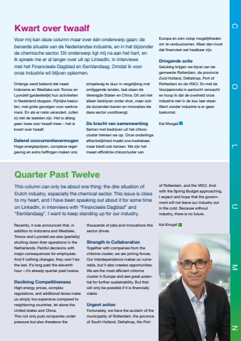 SPREEKBUIS april 20255Onlangs werd bekend dat naast Indorama en Westlake ook Tronox en Lyondell (gedeeltelijk) hun activiteiten in Nederland stoppen. Pijnlijke besluiten, met grote gevolgen voor werknemers. En als er niets verandert, zullen zij niet de laatsten zijn. Het is allang geen twee voor twaalf meer %u2013 het is kwart over twaalf.Dalend concurrentievermogenHoge energieprijzen, complexe regelgeving en extra heffingen maken ons simpelweg te duur in vergelijking met omliggende landen, laat staan de Verenigde Staten en China. Dit zet niet alleen bedrijven onder druk, maar ook de duizenden banen en innovaties die deze sector voortbrengt.De kracht van samenwerkingSamen met bedrijven uit het chloorcluster trekken we op. Onze onderlinge afhankelijkheid maakt ons kwetsbaar, maar biedt ook kansen. We zijn het meest effici%u00ebnte chloorcluster van Kwart over twaalfVoor mij kan deze column maar over %u00e9%u00e9n onderwerp gaan: de benarde situatie van de Nederlandse industrie, en in het bijzonder de chemische sector. Dit onderwerp ligt mij na aan het hart, en ik spreek me er al langer over uit op LinkedIn, in interviews met het Financieele Dagblad en EenVandaag. Omdat ik voor onze industrie wil blijven opkomen.Europa en zien volop mogelijkheden om te verduurzamen. Maar dan moet dat financieel wel haalbaar zijn.Dringende actieGelukkig krijgen we bijval van de gemeente Rotterdam, de provincie Zuid-Holland, Deltalinqs, Port of Rotterdam en de VNCI. En met de Voorjaarsnota in aantocht verwacht en hoop ik dat de overheid onze industrie niet in de kou laat staan. Want zonder industrie is er geen toekomst.Kal Khogali Recently, it was announced that, in addition to Indorama and Westlake, Tronox and Lyondell are also (partially) shutting down their operations in the Netherlands. Painful decisions with major consequences for employees. And if nothing changes, they won%u2019t be the last. It%u2019s long past the eleventh hour%u2014it%u2019s already quarter past twelve.Declining CompetitivenessHigh energy prices, complex regulations, and additional levies make us simply too expensive compared to neighboring countries, let alone the United states and China. This not only puts companies under pressure but also threatens the Quarter Past TwelveThis column can only be about one thing: the dire situation of Dutch industry, especially the chemical sector. This issue is close to my heart, and I have been speaking out about it for some time on LinkedIn, in interviews with %u201cFinancieele Dagblad%u201d and %u201cEenVandaag%u201d. I want to keep standing up for our industry.thousands of jobs and innovations this sector drives.Strength in CollaborationTogether with companies from the chlorine cluster, we are joining forces. Our interdependence makes us vulnerable, but it also creates opportunities. We are the most efficient chlorine cluster in Europe and see great potential for further sustainability. But that will only be possible if it is financially viable.Urgent action Fortunately, we have the acclaim of the municipality of Rotterdam, the province of South Holland, Deltalinqs, the Port of Rotterdam, and the VNCI. And with the Spring Budget approaching, I expect and hope that the government will not leave our industry out in the cold. Because without industry, there is no future.Kal Khogali COLUMN
