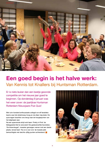 SPREEKBUIS april 2025 6 Een goed begin is het halve werk:Van Kennis tot Knallers bij Huntsman Rotterdam. Er is niets leuker dan een beetje gezonde competitie om het nieuwe jaar goed te beginnen. Op donderdag 9 januari was het weer zover: de jaarlijkse Huntsman Rotterdam Nieuwjaars Pub Quiz!Met ruim honderd enthousiaste collega%u2019s en elf fanatieke teams was het strijdniveau hoog en de sfeer n%u00f3g beter. De quizvragen brachten ons terug naar de hoogtepunten van het afgelopen jaar. Na een spannende strijd wist team %u2018Pretty in Pink%u2019 de felbegeerde titel te veroveren! De gedoodverfde favorieten, %u2018De linkervleugel%u2019, moesten genoegen nemen met een derde plaats, terwijl team %u2018Nu is ie voor ons%u2019 de tweede plek bemachtigde met slechts vijftig punten achterstand.