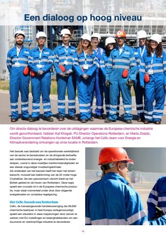 SPREEKBUIS september 2025 10 Om directe dialoog te bevorderen over de uitdagingen waarmee de Europese chemische industrie wordt geconfronteerd, hebben Kal Khogali, PU Director Operations Rotterdam, en Marta Zoladz, Director Government Relations Huntsman EAME, onlangs het Cefic-team voor Energie en Klimaatverandering ontvangen op onze locatie in Rotterdam. Het bezoek was bedoeld om de operationele werkelijkheid van de sector te benadrukken en de dringende behoefte aan ondersteunend energie- en industriebeleid te onderstrepen, vooral in deze moeilijke marktomstandigheden en een steeds ongunstiger investeringsklimaat.Als onderdeel van het bezoek heeft het team het terrein bezocht, inclusief een beklimming van de 52 meter hoge Crystallizer, die een panoramisch uitzicht biedt op het Botlek-gebied en de haven van Rotterdam. Deze regio speelt een cruciale rol in de Europese chemische productie, maar staat momenteel onder druk door stijgende energiekosten en complexe regelgeving.Het Cefic-bezoek aan RotterdamCefic, de toonaangevende handelsvereniging die 28.000 chemische bedrijven in heel Europa vertegenwoordigt, speelt een sleutelrol in deze inspanningen door samen te werken met EU-instellingen en belanghebbenden om een duurzame en veerkrachtige industrie te bevorderen. Een dialoog op hoog niveau