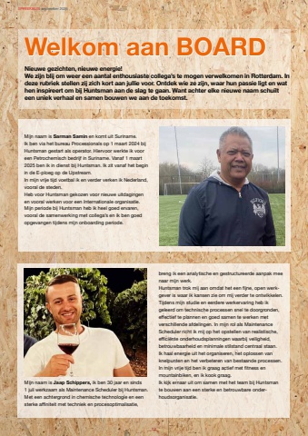 SPREEKBUIS september 2025 12 Mijn naam is Jaap Schippers, ik ben 30 jaar en sinds 1 juli werkzaam als Maintenance Scheduler bij Huntsman. Met een achtergrond in chemische technologie en een sterke affiniteit met techniek en procesoptimalisatie, breng ik een analytische en gestructureerde aanpak mee naar mijn werk.Huntsman trok mij aan omdat het een fijne, open werkgever is waar ik kansen zie om mij verder te ontwikkelen. Tijdens mijn studie en eerdere werkervaring heb ik geleerd om technische processen snel te doorgronden, effectief te plannen en goed samen te werken met verschillende afdelingen. In mijn rol als Maintenance Scheduler richt ik mij op het opstellen van realistische, effici%u00ebnte onderhoudsplanningen waarbij veiligheid, betrouwbaarheid en minimale stilstand centraal staan.Ik haal energie uit het organiseren, het oplossen van knelpunten en het verbeteren van bestaande processen. In mijn vrije tijd ben ik graag actief met fitness en mountainbiken, en ik kook graag.Ik kijk ernaar uit om samen met het team bij Huntsman te bouwen aan een sterke en betrouwbare onderhoudsorganisatie.Mijn naam is Sarman Samin en komt uit Suriname.Ik ben via het bureau Processionals op 1 maart 2024 bij Huntsman gestart als operator. Hiervoor werkte ik voor een Petrochemisch bedrijf in Suriname. Vanaf 1 maart 2025 ben ik in dienst bij Huntsman. Ik zit vanaf het begin in de E-ploeg op de Upstream.In mijn vrije tijd voetbal ik en verder verken ik Nederland, vooral de steden.Heb voor Huntsman gekozen voor nieuwe uitdagingen en vooral werken voor een Internationale organisatie.Mijn periode bij Huntsman heb ik heel goed ervaren, vooral de samenwerking met collega%u2019s en ik ben goed opgevangen tijdens mijn onboarding periode.Welkom aan BOARDNieuwe gezichten, nieuwe energie!We zijn blij om weer een aantal enthousiaste collega%u2019s te mogen verwelkomen in Rotterdam. In deze rubriek stellen zij zich kort aan jullie voor. Ontdek wie ze zijn, waar hun passie ligt en wat hen inspireert om bij Huntsman aan de slag te gaan. Want achter elke nieuwe naam schuilt een uniek verhaal en samen bouwen we aan de toekomst.
