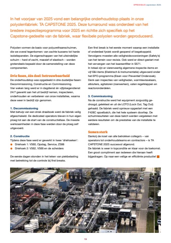 SPREEKBUIS september 2025 6 Michael van BinsbergenDe dag van...Michael van Binsbergen werkt sinds januari 2025 als Environmental Manager bij Huntsman in het EHS-team. Hij houdt zich bezig met milieugerelateerde zaken zoals vergunningen, bodemkwaliteit, luchtemissies, inspecties en rapportages. Voordat hij in vaste dienst kwam, werkte hij al als externe kracht, wat hem een goed beeld gaf van de milieu-uitdagingen binnen het bedrijf. Zijn werk is zeer gevarieerd en kent geen vaste structuur. Michael werkt deels thuis en deels op kantoor, en is op maandag, dinsdag en donderdag aanwezig op de vierde verdieping van het hoofdgebouw.5:40 UUR Bij het ochtendgloren gaat de wekker, waarna ik rustig uit bed stap om me aan te kleden. Mijn vriendin gaat dan ook uit bed en zorgt voor een warm havermoutontbijt. Rond 6.30 uur stap ik vervolgens in de auto om vanuit Breda richting Botlek te rijden. 07:15 UUR Afhankelijk van de drukte ben ik rond dit tijdstip op kantoor. Vervolgens doe ik het licht aan op de afdeling en snel daarna volgt vaak Karin. Na een praatje ga ik aan de slag met e-mail of voorbereiding van een overleg.Vandaag staat in het teken van een project. De vergunningsaanvraag hiervoor is in opstelling en er moet van een aantal personen nog wat informatie verkregen worden. Hiervoor heb ik dan ook verschillende kleine overleggen naast een sitebezoek om de dikte van de bomen te inventariseren en de locatie te bekijken.De informatie die wij moeten opnemen in een vergunningaanvraag is onder andere voor dit project. Wat is de kwaliteit van de bodem? Welke stoffen gaan we gebruiken in de blends en waar gaan we ze opslaan? Verder, wat gaan we doen met de emissies naar de lucht die vrij kunnen komen uit de tanks en nog vele andere details.12:00 UUR Tijd voor de lunch in het bedrijfsrestaurant met de aanwezige collega%u2019s. Tijdens de lunch worden de verschillende vakantieplannen besproken, want de vakantie komt er natuurlijk weer aan. Voor mijzelf wordt het een rustige zomer omdat ik op de planning heb staan om in november wat van de zon te genieten in Dubai. Na de lunch start ik weer met wat e-mails die weggewerkt moeten worden.