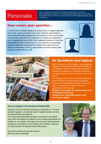 SPREEKBUIS september 2025 10 Om directe dialoog te bevorderen over de uitdagingen waarmee de Europese chemische industrie wordt geconfronteerd, hebben Kal Khogali, PU Director Operations Rotterdam, en Marta Zoladz, Director Government Relations Huntsman EAME, onlangs het Cefic-team voor Energie en Klimaatverandering ontvangen op onze locatie in Rotterdam. Het bezoek was bedoeld om de operationele werkelijkheid van de sector te benadrukken en de dringende behoefte aan ondersteunend energie- en industriebeleid te onderstrepen, vooral in deze moeilijke marktomstandigheden en een steeds ongunstiger investeringsklimaat.Als onderdeel van het bezoek heeft het team het terrein bezocht, inclusief een beklimming van de 52 meter hoge Crystallizer, die een panoramisch uitzicht biedt op het Botlek-gebied en de haven van Rotterdam. Deze regio speelt een cruciale rol in de Europese chemische productie, maar staat momenteel onder druk door stijgende energiekosten en complexe regelgeving.Het Cefic-bezoek aan RotterdamCefic, de toonaangevende handelsvereniging die 28.000 chemische bedrijven in heel Europa vertegenwoordigt, speelt een sleutelrol in deze inspanningen door samen te werken met EU-instellingen en belanghebbenden om een duurzame en veerkrachtige industrie te bevorderen. Een dialoog op hoog niveau
