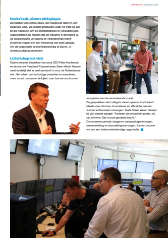 SPREEKBUIS september 20253Sterke basis, nieuwe uitdagingenWe hebben een sterke basis, een toegewijd team en een duidelijke visie. We bieden producten waar we trots op zijn en die nodig zijn om de energietransitie te verwezenlijken. Tegelijkertijd is de realiteit dat de industrie in beweging is. De economische vertraging en veranderende marktdynamiek vragen om een herziening van onze aanpak. Om als organisatie toekomstbestendig te blijven, is vereenvoudiging essentieel. Leiderschap met visieTijdens recente bezoeken van onze CEO Peter Huntsman en de nieuwe President Polyurethanes Steen Weien Hansen werd duidelijk dat er veel aandacht is voor de Rotterdamse site. Niet alleen om de huidige prestaties te waarderen, maar vooral om samen te kijken naar hoe we ons kunnen aanpassen aan de veranderende markt.De gesprekken met collega%u2019s waren open en inspirerend. Idee%u00ebn over slimmer, innovatiever en effici%u00ebnter werken werden enthousiast ontvangen. Zoals Steen Weien Hansen bij zijn bezoek aangaf: %u201cAnderen zijn misschien groter, wij zijn slimmer. Dat is onze grootste kracht.%u201dDe komende periode vraagt om aanpassingsvermogen, samenwerking en doorzettingsvermogen. Samen bouwen we aan een toekomstbestendige organisatie.